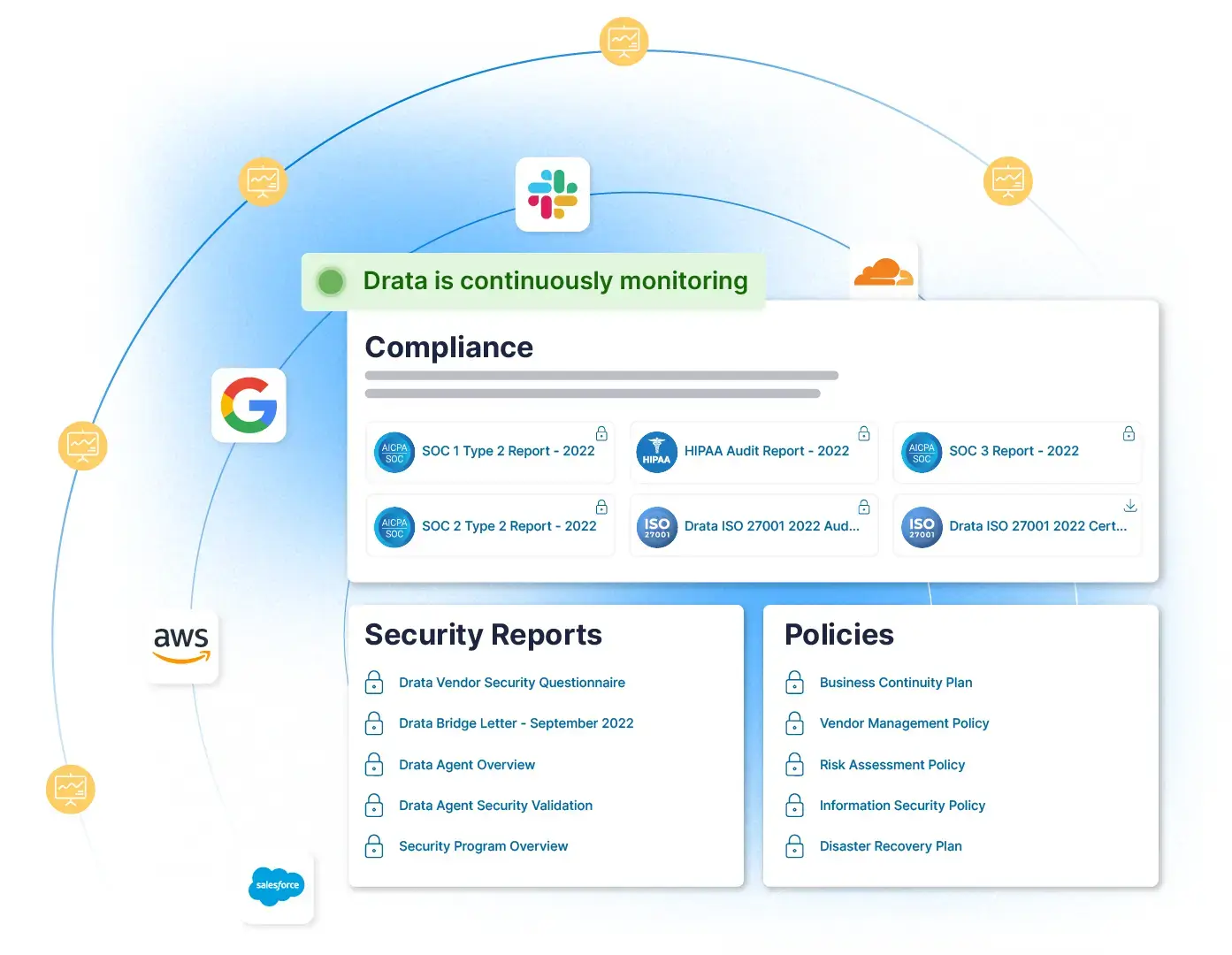 Drataは、コンプライアンス、リスク管理、セキュリティーレビューを自動化するAIネイティブプラットフォームであり、従来のガバナンス、リスク、コンプライアンス(GRC)プロセスを変革します。ガバナンス、リスク、コンプライアンス、アシュアランスを一元管理することで、GRCを防御的な必需品から積極的なビジネス推進力へと変革します。Drataのプラットフォームは数百ものシステムと統合されており、監査ハブ、トラストセンター、自動アクセスレビューシステムなどの機能を提供します。また、包括的なリスク管理プラットフォームとオールインワンのベンダーリスク管理も提供します。